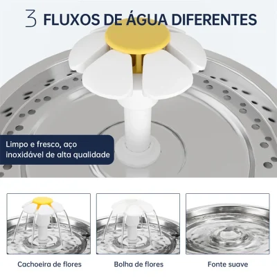 Incentiva a Hidratação: O fluxo contínuo de água atrai naturalmente o pet para beber mais, e você pode escolher entre 3 modos de fluxo: Cachoeira da Flor, Flor Borbulhante ou Fonte Delicada.